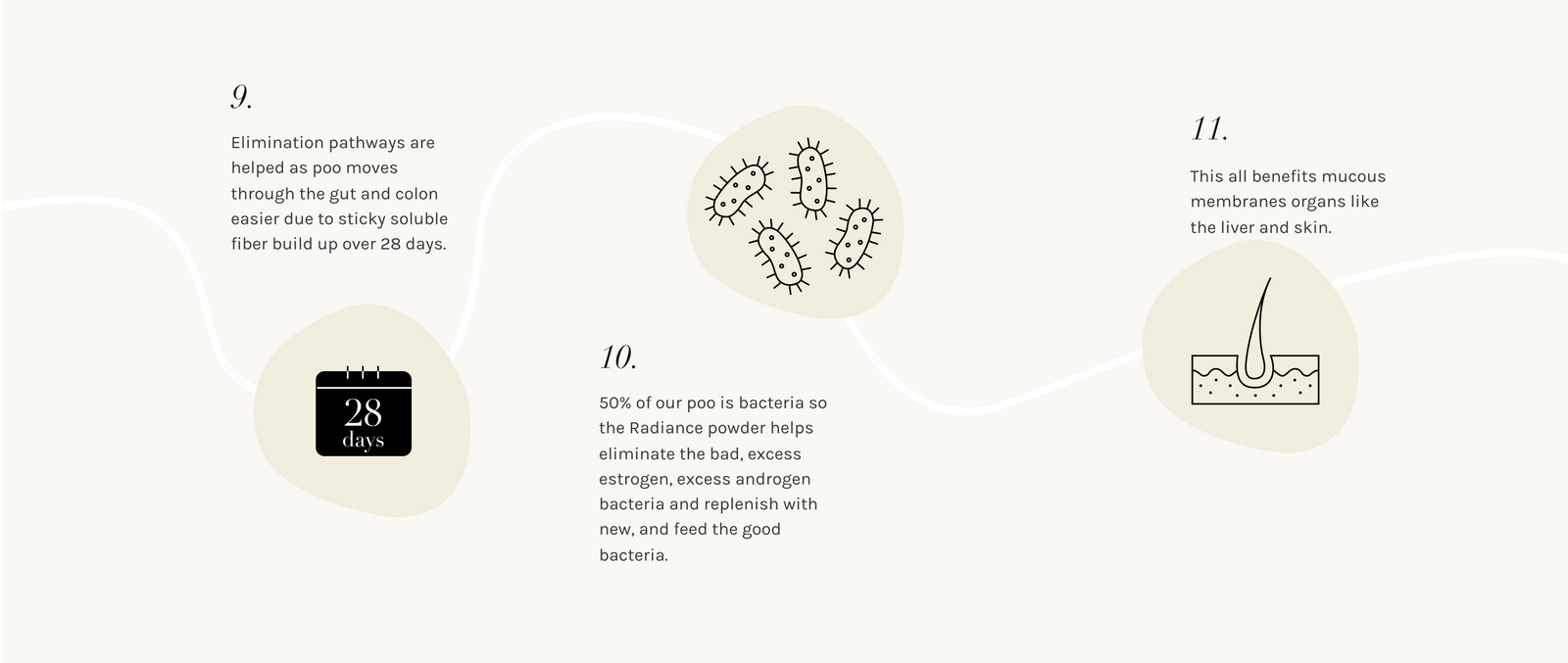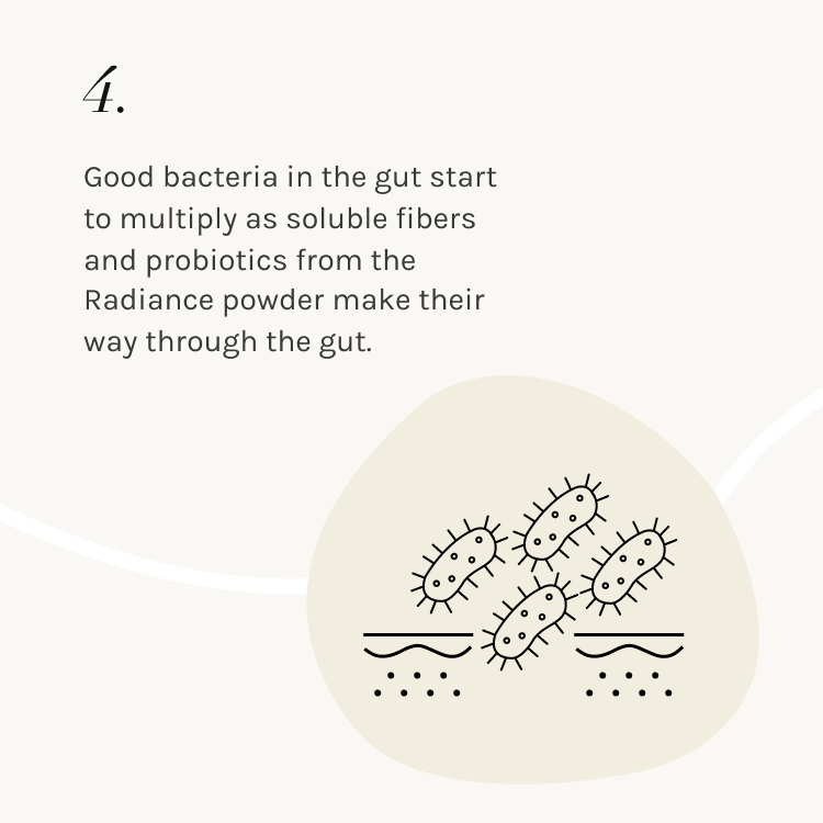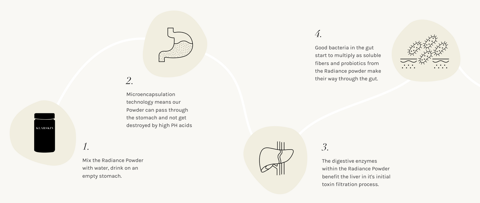 The development process of The Radiance Powder is unique. The raw materials are encapsulated to ensure they reach the GI tract and Colon where the ingredients can effectively multiply and have the most absorption benefits. They are not activated until mixed with water, which keeps potency at an optimum. The formula continues to work past the consumption period, meaning longer-term results.
